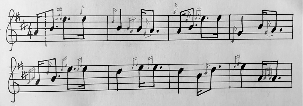The following is a first attempt to interpret the ornamentation used in the opening slow section of the performance based on a regularised rendering of the melody as played. Identifying the nature and pitch of the gracings accurately is challenging and several of those offered are approximations or suggestions from a wide range of options viable on the fiddle. We would welcome others’ more expert analysis and interpretation.