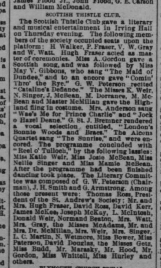 Scots Dance and Feast. San Francisco Thistle Club Holds its Sixteenth Annual Hogmanay Supper The evening’s amusement started with dancing to Scottish music and among the dances were the ‘Highland Schottische’ and the ‘Reel o’ Tulloch‘. Donald Weir officiated as piper. [San Francisco Call Volume 81, No. 32 1 January 1897. p. 14]