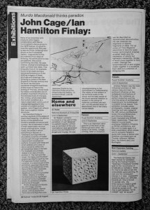 At the time of the exhibition John Cage was interviewed by Eddie McGuire and Stephen Arnold. A transcript of the interview was published in Cencrastus (‘John Cage in Conversation’, No 21, Summer 1985: 5-9).