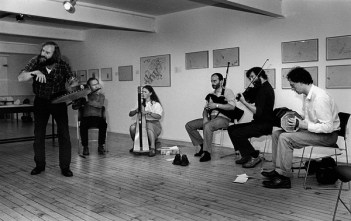 At the party Cage posted McGuire and his fellow players of fiddle, lowland pipes, concertina, clarsach and bodhran (hand drum) at fa-flung corners of the gallery, seething by this time with a large gathering, including Hamish Henderson of the School of Scottish Studies, the poets Liz Lochhead and William Montgomery, and numerous artists and musicians from both classical and folk disciplines.